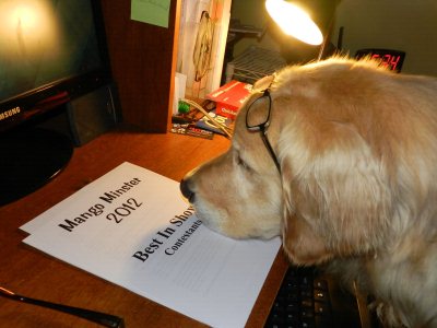Apart from a few offers of inappropriate gifts from certain contestants, which were, of course, quite properly reported by the judges to the Mango, there was a satisfactory decline in outright bribery in this year's Mango Minster, due in no small part to the outstanding assistance Abby received from Morgan, Kuster and Cousin Pretty Girl in guarding against overtly unethical behavior. The judging of the Too Darn Cute category being over and hearing no objection, Abby has released the snow machines from impound and had them shipped, at Frankie Furter's expense, to Judge Fiona.